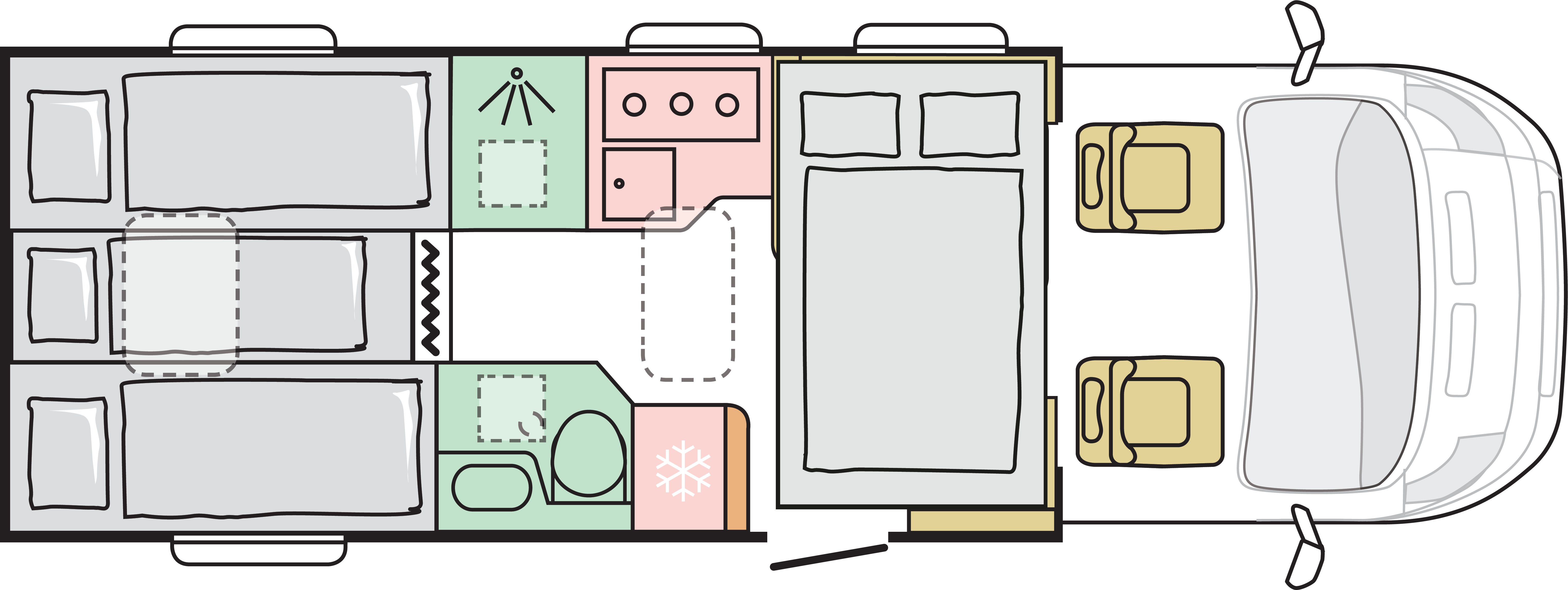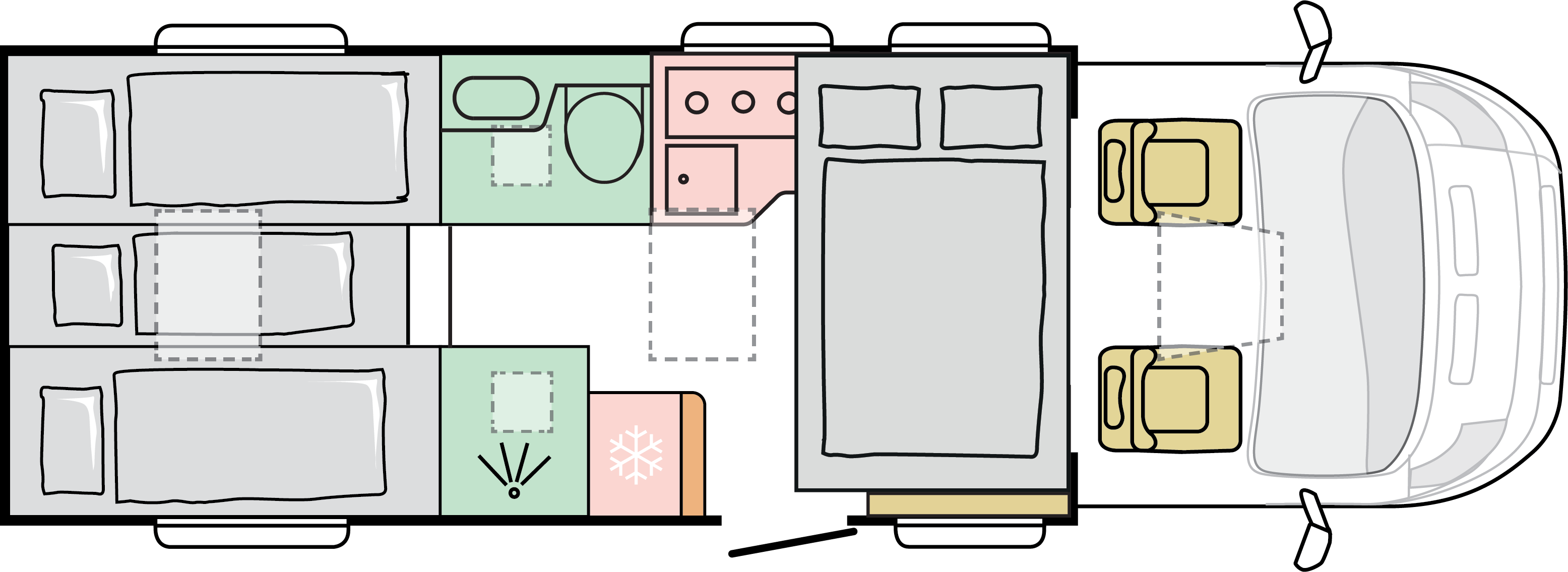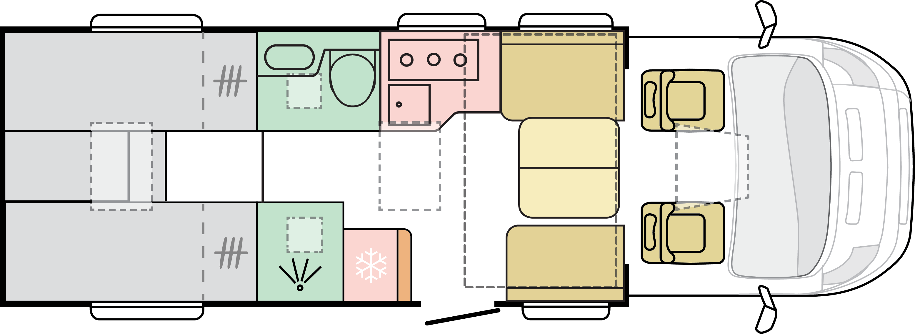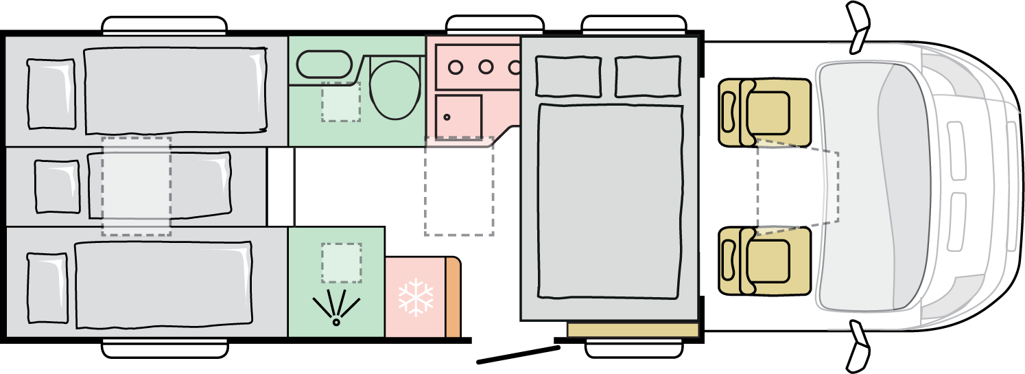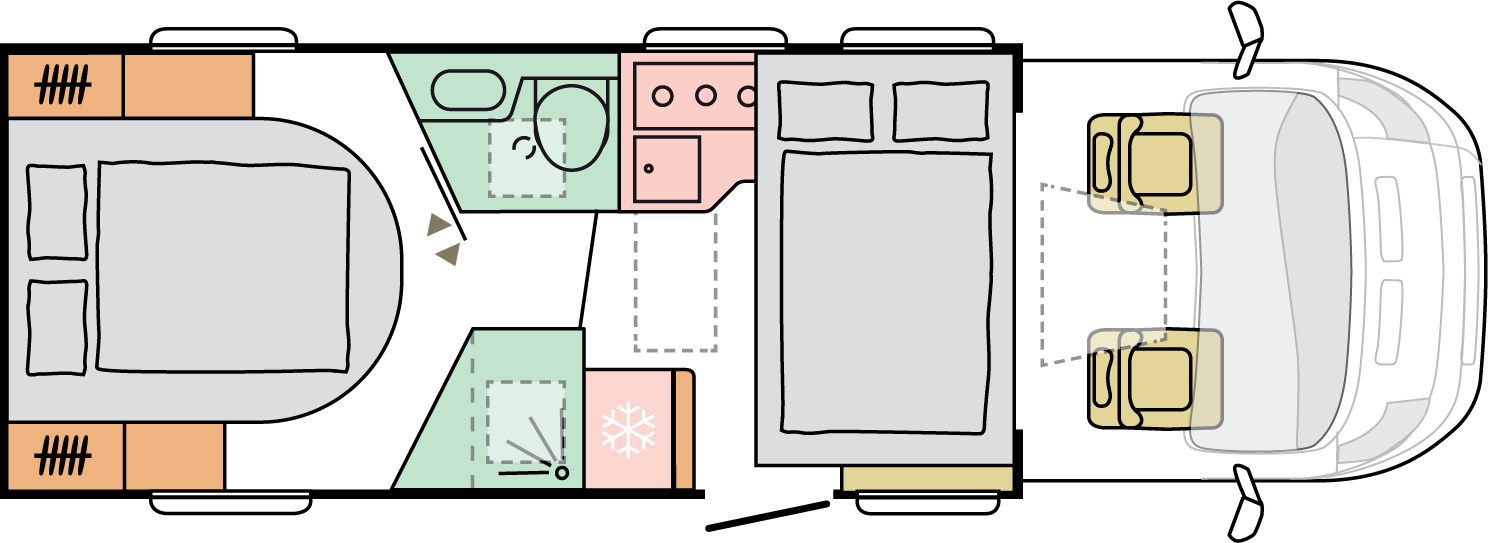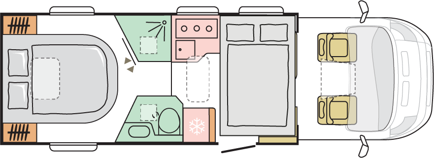 Våra husbilar är noggrant utformade för att ge dig en hemtrevlig känsla, med sin öppna och rymliga interiör.