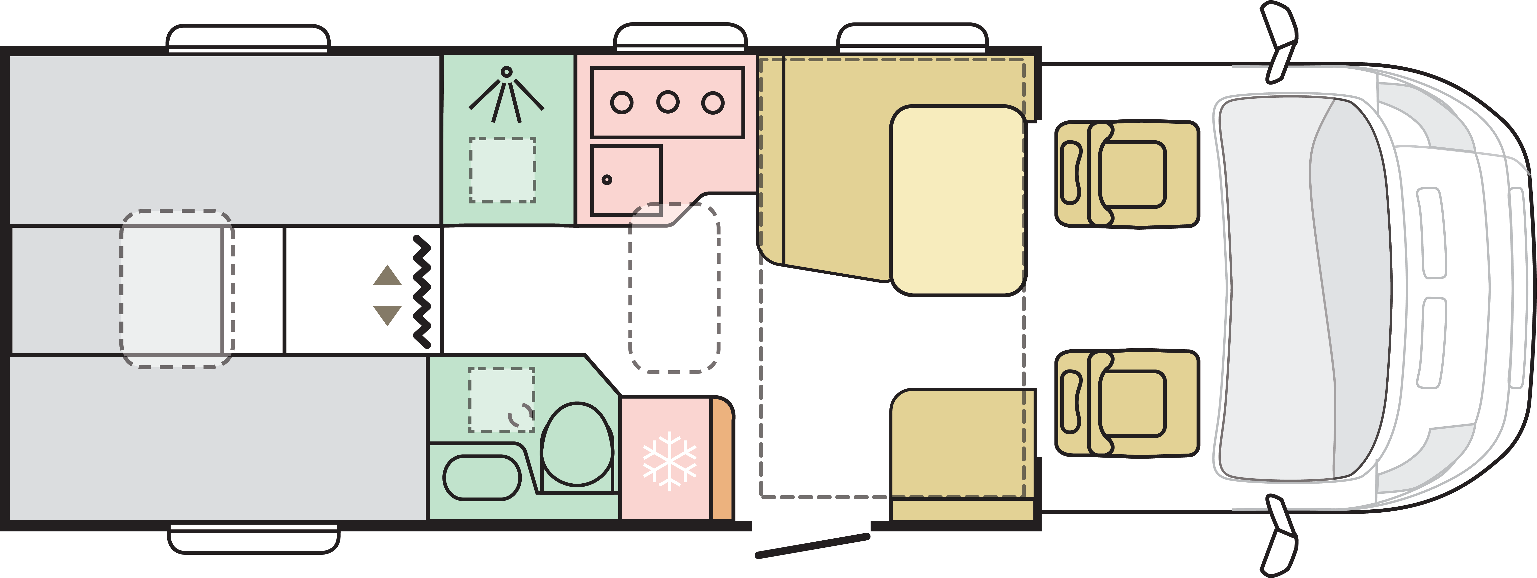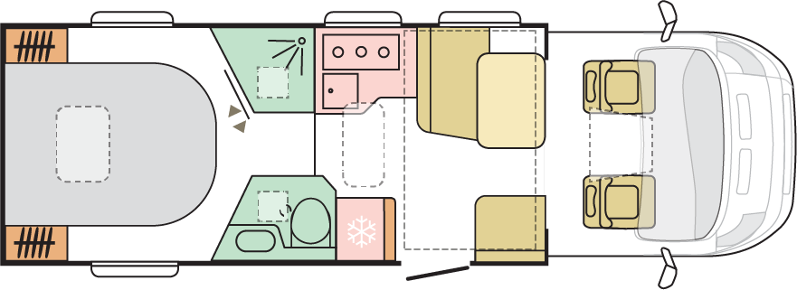 Alla husbilar har tekniskt dubbelgolv, vilket ger ett plant golv och 13 cm utrymme under golvet för integrerade verktyg, isolering och extra förvaring. Färskvattentankarna är optimalt placerade för fordonets balans och hantering, tillverkade i ett enda stycke för hållbar läckagefri funktion och är lättåtkomlig via dubbelgolvet.