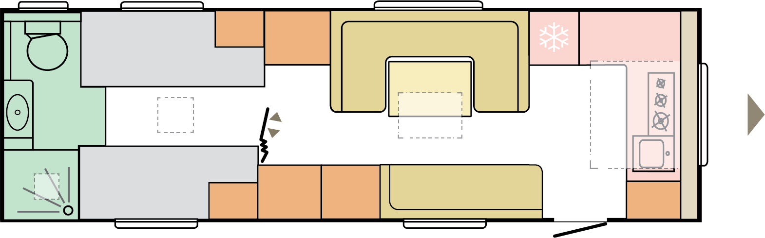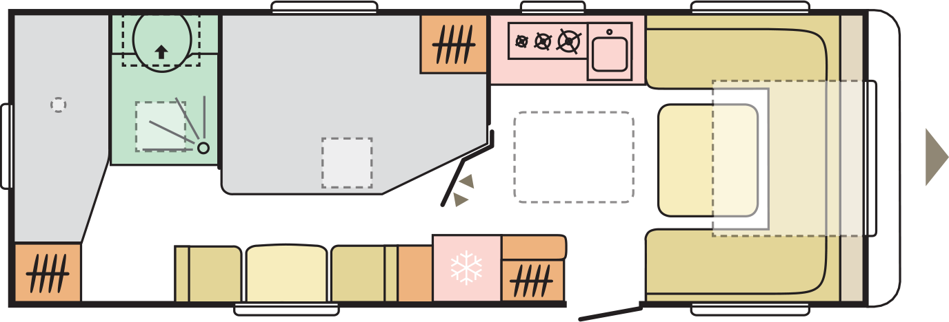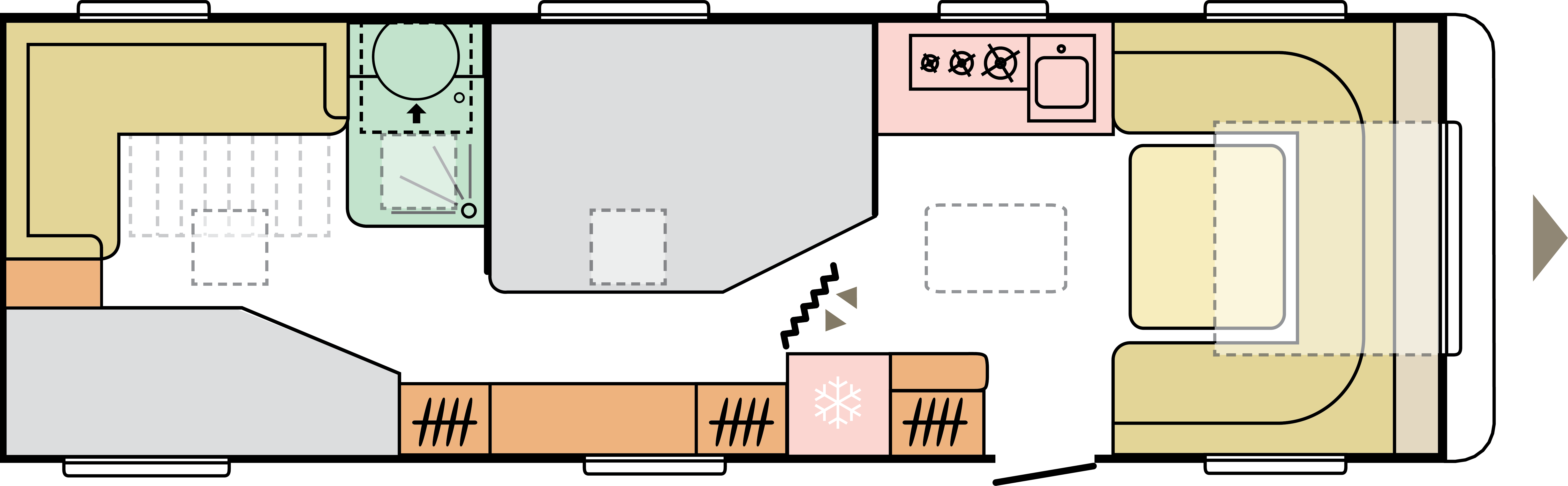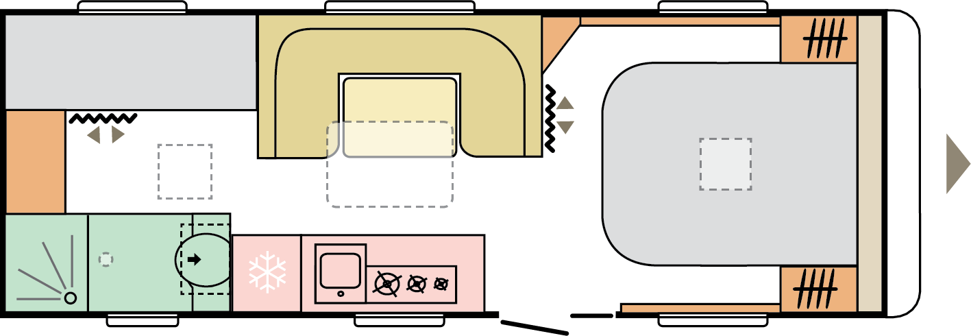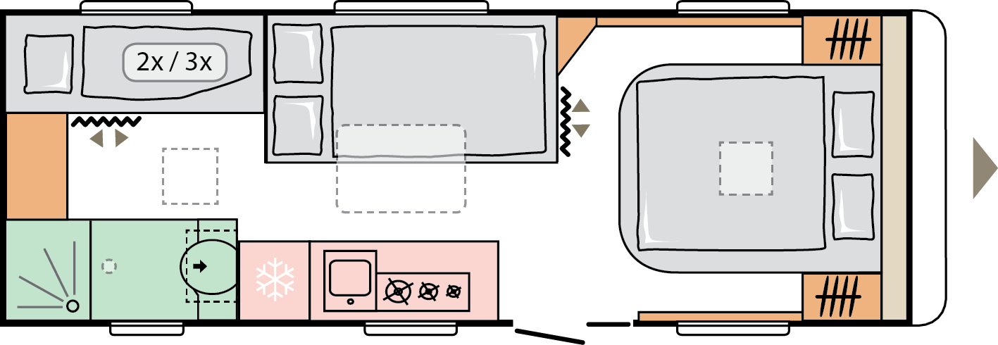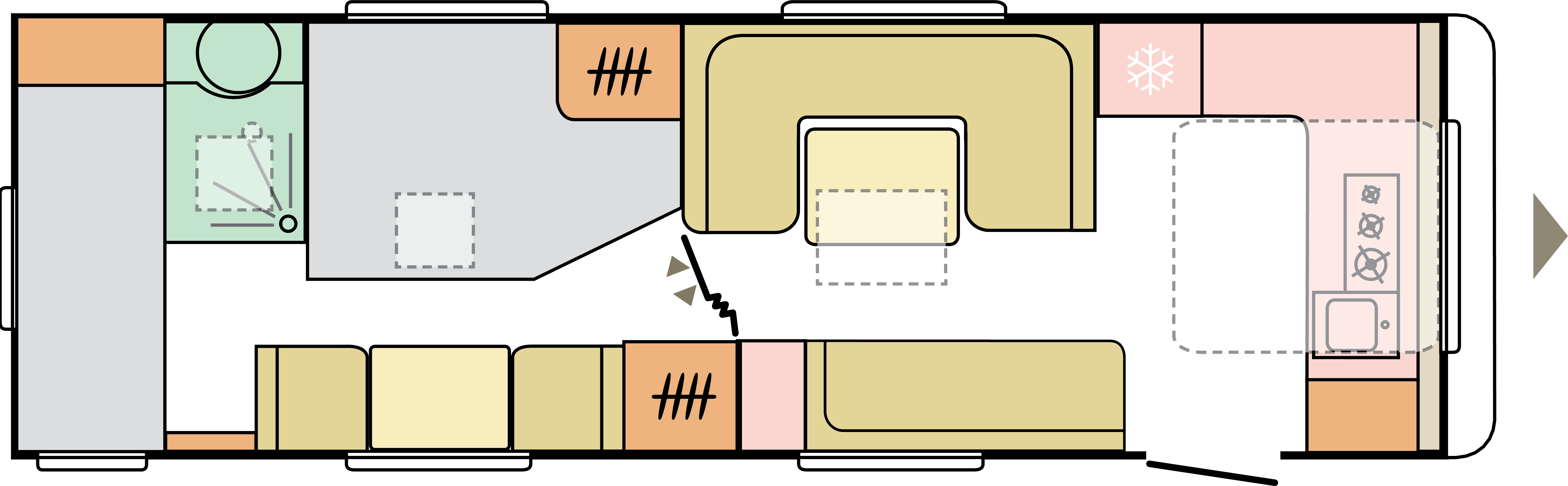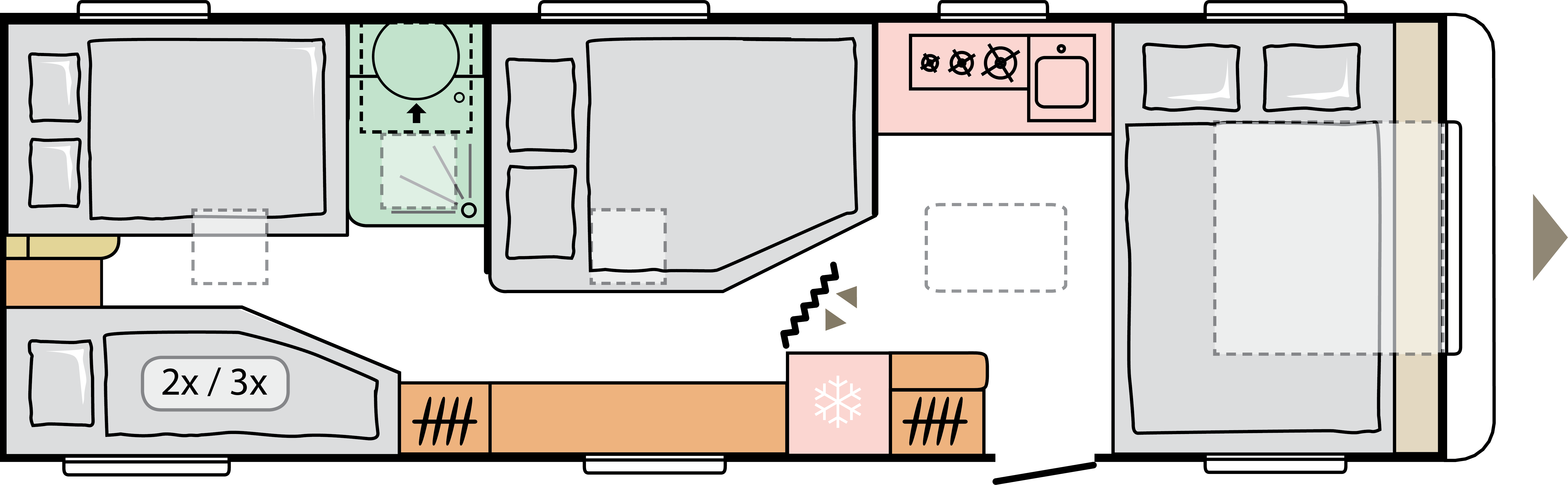 Våra husvagnar är noggrant utformade för att ge dig hemtrevnad, med en rymlig och elegant interiör.